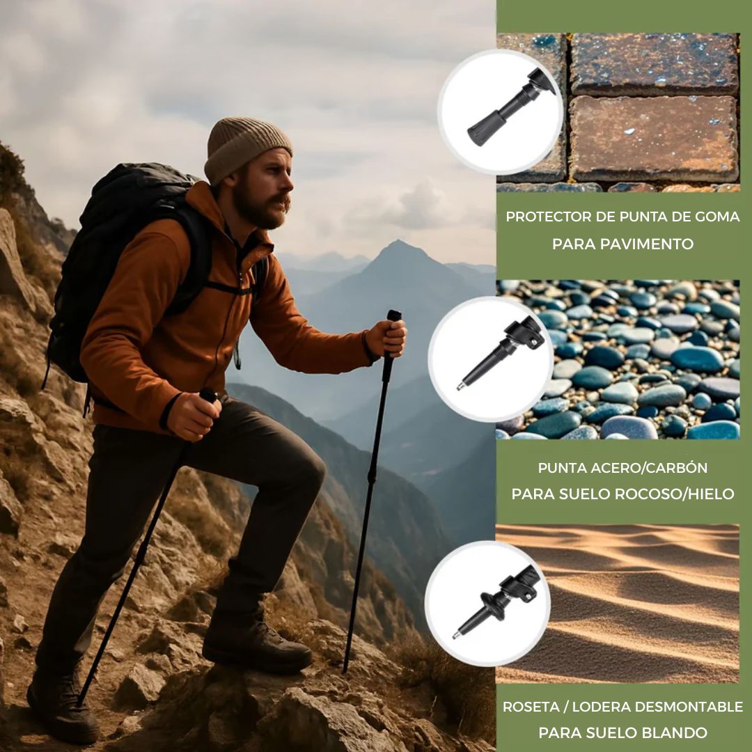 – Mango de EVA, correa de muñeca ajustable que proporciona mayor soporte y reduce la fatiga en caminatas largas