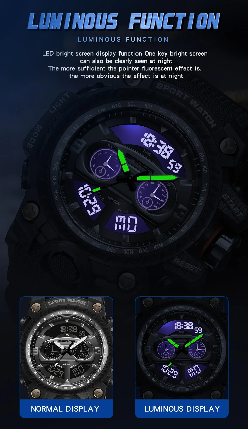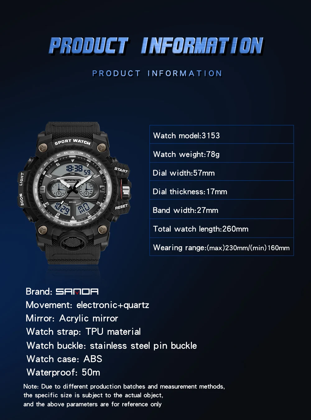 – SANDA 3153 NEGRO – Deportivo, digital y análogo – Resistente al agua – Material: correa de poliuretano, carcasa de ABS
